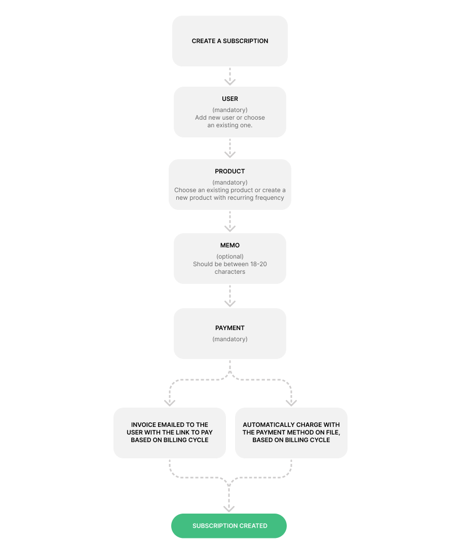 Subscriptions allow you to charge a user on a recurring basis. Subscription creation requires items which are product prices that have a “recurring plan” frequency. Subscription will generate invoices according to the billing cycle (monthly, weekly, biweekly, annually).