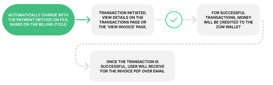 If the subscription was created with the option “Automatically charge user”, Zūm will initiate a transaction to collect the payment. If the transaction fails, the invoice will remain in the “open” status with the transaction status “failed”. We will not re-initiate the transaction at this stage. If the subscription was created with the option “Email invoice to user to pay manually”, Zūm will wait for the user to initiate a transaction. If the user pays the invoice and the payment is successful, the invoice updates to paid. If they don’t make a payment, the invoice will remain open until the due date is reached. Once the due date is reached, the invoice status will change to Past due. If the user tries to pay an invoice that is past due, they will still be able to make the payment.